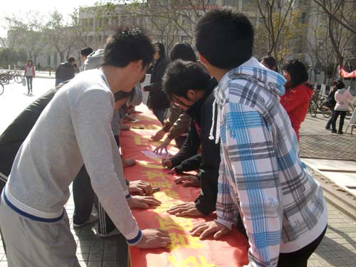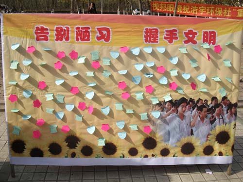 活动前期宣传部和《体育风》成员积极筹备策划,制作相关条幅、贴字板、展板等。为此次活动的成功举办做了充分准备,以拓展此次活动的跨度和深度。醒目的条幅,耐人深思的图片,将同学们的目光吸引而来,同学们纷纷在条幅上留下了自己的名字,并把自己的想法和建议贴在贴板上,以表达“宣扬文明,谴责陋习”的心声。此外,活动中还不乏新疆同学及外国职工用自己的语言表示对此次活动的支持。随着活动的深入,现场人员攒动,气氛逐渐升温,一度出现签字笔不够用的现象。正午,条幅、贴板早已被密密麻麻的签名留言填满。活动在一片和谐、向上的氛围中圆满结束。此次活动旨在引导老员工树立文明新风、养成文明习惯,提高勤俭节约意识。在日常的生活中,从小事做起,讲文明、讲卫生、讲奉献。严格要求自己,提高自己的综合素质,为建设和谐文明校园奉献自己力量。活动中,有员工表示,“与陋习告别,与文明握手”是我们在校老员工的共同愿望,希望通过一系列活动,能提高老员工的文明意识,今后的校园更加和谐、文明、完美。