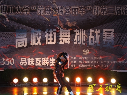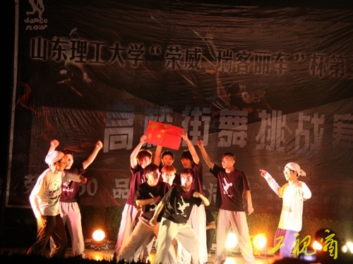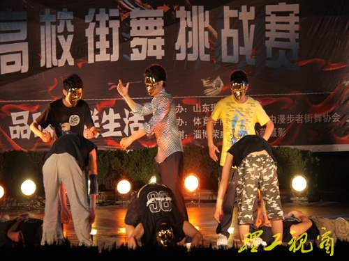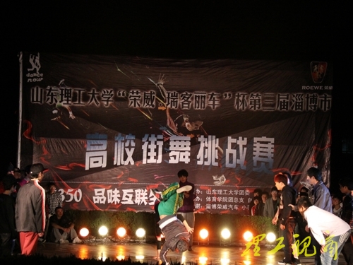 老员工艺术广场上音乐劲爆,活力四射。来自淄博市各高校街舞爱好者以及淄博地区街舞俱乐部的8支舞蹈队参加了比赛。随着主持人热情的开场白,四人组合街舞表演给现场观众们献上了给力十足的开场舞。比赛包括Breaking、Popin、Locking、Jazz、Hip-hop等舞种。现场座无虚席,过道上也站满了人。参赛选手们个性的发型、张扬的服装、跳动的音乐、帅气的动作使整场比赛充满活力。各高校精彩绝伦的演出将比赛一次次推向高潮。翻滚、倒立、弹跳、旋转等高技巧的街舞动作展现出舞者强大的力量、柔韧性和协调性。女生的街舞表演丝毫也不逊色于男生。