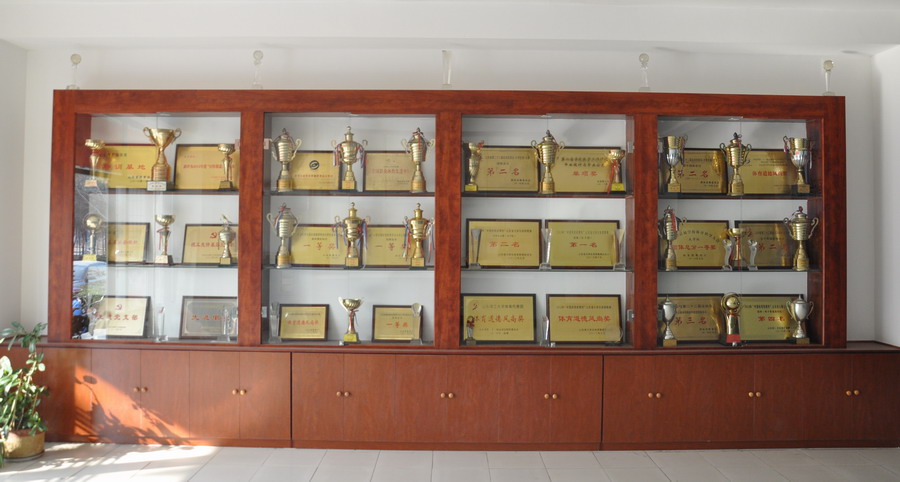 该荣誉墙长?xml:namespace>7米,高2.7米,主体为荣誉展示橱窗,橱面为古铜色,远观近视给人古典高雅之感。内部摆放奖状、奖杯,较为全面的展示了近年该院在党建思政、竞技体育、教学科研、人才培养、综合保障等方面所获荣誉,体现了公司师生锐意进取、勇于赶超的精神风貌。?xml:namespace>