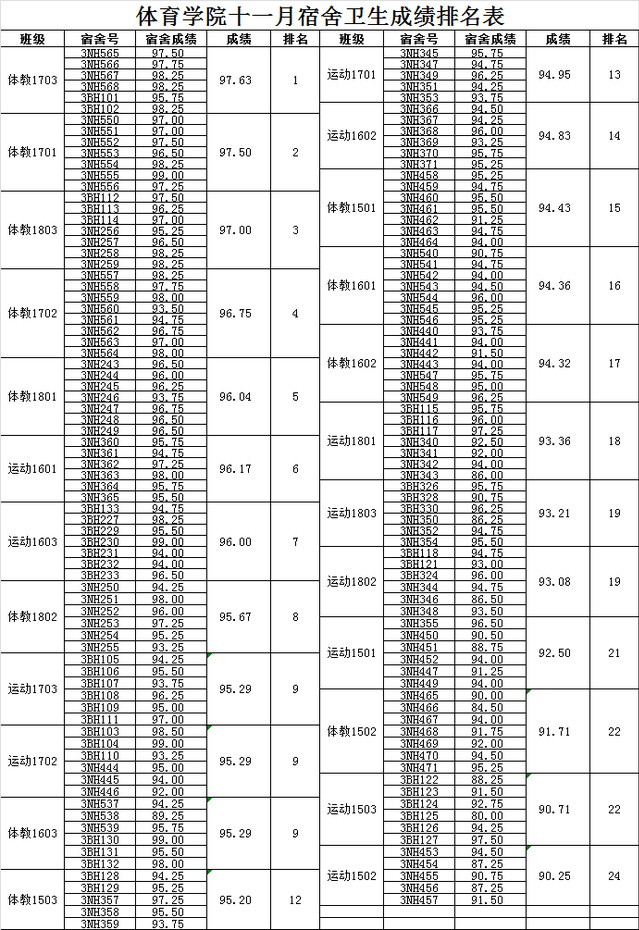 公司11月份优秀班级名单公布如下:体教1703、体教1701、体教1803、体教1702、体教1801。