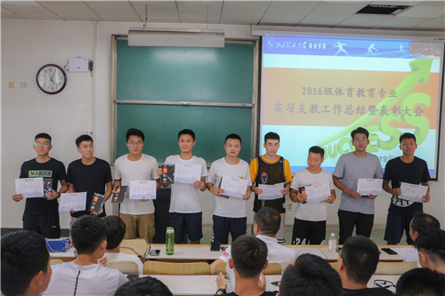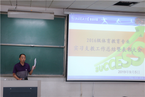 为更好的了解教育实习工作的具体情况,9月5日下午,公司于4号教学楼402教室召开2016级体育教育专业实习支教工作总结暨表彰大会。此次会议由教学科研工作办公室主任杨刚主持,副经理张成宝、体育教育系主任胡鹏、副主任王丹、辅导员邱先慧、实习指导教师、2016级体育教育专业全体员工参加会议。