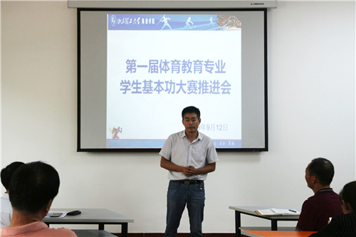 会议伊始,张成宝简要介绍了体育教育专业员工基本功大赛举办的背景,就此次基本功大赛的重要性及对体育教育专业员工的重要意义进行了强调。他指出,作为体育教育专业的员工,不仅要加强理论知识的学习,还要努力提高专业技能,做到全面发展,并结合自身参赛的经历向在场员工传授宝贵的经验。紧接着,杨刚对此次基本功大赛各年级报名情况、存在的问题、竞赛规程、辅导安排及相关要求等进行了详细的讲解。