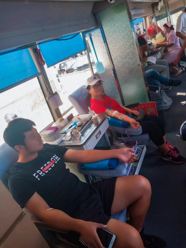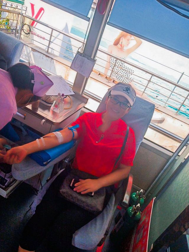 我认为这次献血是为了庆祝祖国七十华诞而举办的特殊又有意义的活动,一开始我特别紧张,但是看到周围的同学都特别亢奋,每个人脸上都洋溢着开心与自豪的笑容,让无偿献血现场的气氛高涨起来,也慢慢的就舒缓了心情,这是我们班第一次集体组织活动,感谢王小迪老师和杨玺学长给予了我们很大鼓励。