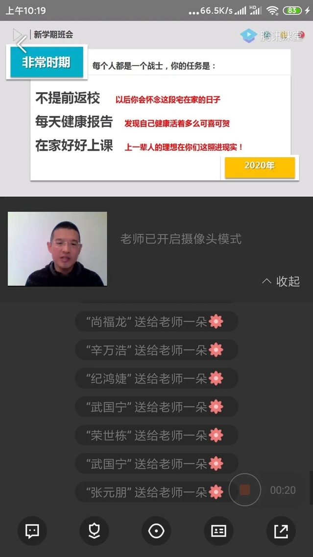 2019级辅导员高勇围绕”疫情防控、班情学情分析、停课不停学”三个方面, 在疫情防控方面,与同学们讨论了从1月23日武汉封城到今日疫情状况和公司公司师生做出的抗疫措施;在班情学情方面,分析了同学们上学期的学习成绩,并且为同学们做出总结;在停课不停学的方面,提到同学们在家进行网上教学要如同在校上课一样认真,及时向老师反馈。