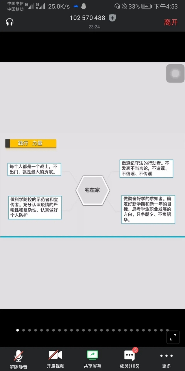 2017级辅导员郝鹏围绕“践行•力量、使命•担当”主题开展讨论,并提出我们每人都是一名战士,要做到不提前返校、每天健康报告、在家好好上课,进一步强调遵守公司疫情防控工作部署安排。