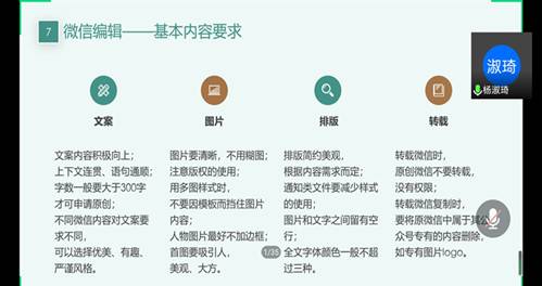 5月25日,校员工会新闻媒体部副部长杨淑琦以“新媒体培训之微信制作及后台操作培训”为主题进行了讲述。杨淑琦同学结合工作实际案例针对性地讲解了微信撰写的要求与技巧,并重点讲解了新媒体的应用技巧——封面图片和动图的制作。此外,还分享了“如何搜集素材图片”“如何利用插件”等一系列实用技巧。最后,她建议同学们把新媒体技巧与思维运用到实际生活中,注重日常观察与积累,不断反思总结来提升新媒体的运用能力。