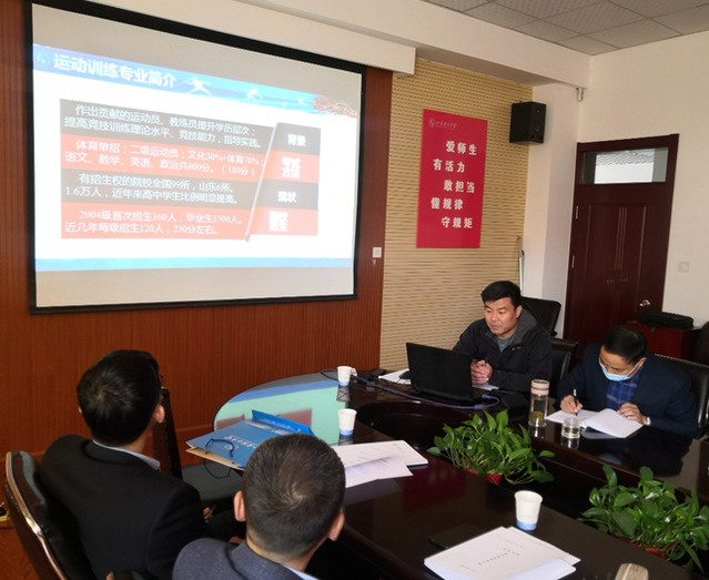 根据专业评估现场考察工作要求,运动训练专业负责人高博从专业定位与建设规划、团队队伍及教学水平、教学建设及教学效果、教学管理、专业特色、问题及措施等方面向专家组进行了汇报。汇报结束后,专家根据在审阅自评报告中发现的问题和通过听汇报需要进一步确定的问题做了针对性的提问和交流。