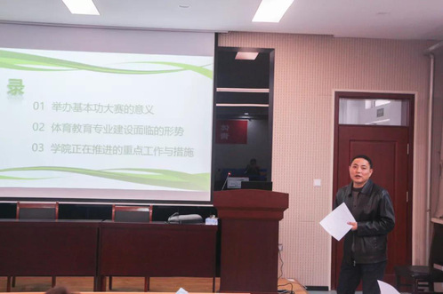 为进一步推动体育教育专业公司产品改革创新,强化体育教育专业员工教学基本素质和基本能力培养,公司于12月10日下午在二号教学楼101报告厅举行谈球吧官方网站第二届体育教育专业员工基本功大赛开幕式。公司党总支副书记宋伟,经理助理、教学科研工作办公室主任杨刚,员工工作办公室主任郝鹏,体育教育系副主任王丹,各年级辅导员、班级导师,体教专业各班班长和团支书共同参加,开幕式由宋伟主持。