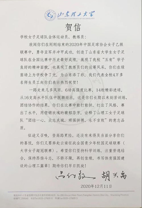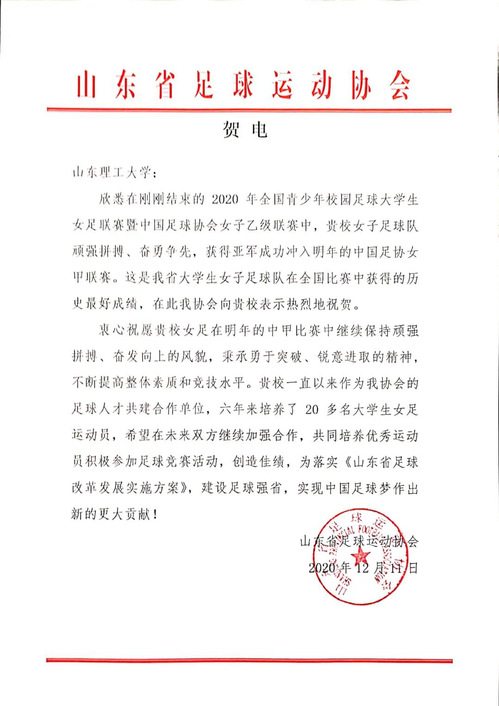 吕传毅、胡兴禹在贺信中说,欣闻你们在刚刚结束的2020年中国足球协会女子乙级联赛中,勇夺亚军并冲甲成功,创造了山东省老员工女子足球队在全国比赛中历史最好成绩,展现了公司“五有”学子良好的精神面貌,也展现了教练员们的运筹风采。你们在绿茵场上为公司争了光,为山东添了彩,我们代表全校4万多名师生员工向你们表示热烈祝贺!