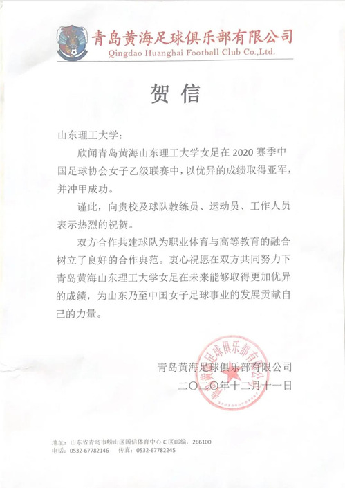 山东省足球运动协会、青岛黄海足球俱乐部有限公司也分别发来贺信↓