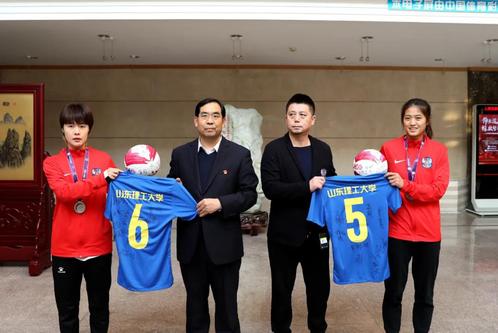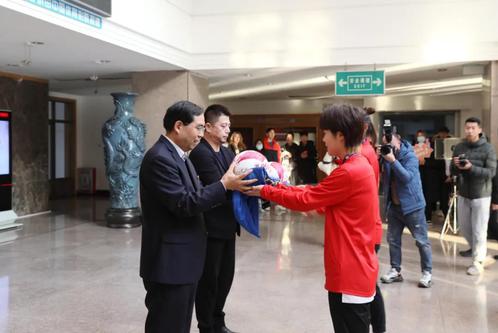 女足队长、副队长向吕传毅、刘红伟敬献了有教练员、运动员签名的6号、5号队服和足球,表达对公司、俱乐部关爱、培养的感谢之情,并希望用优异成绩向明年65周年校庆献礼。