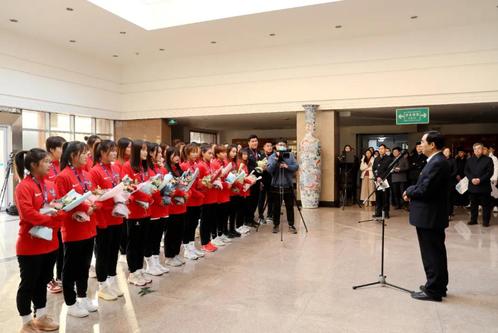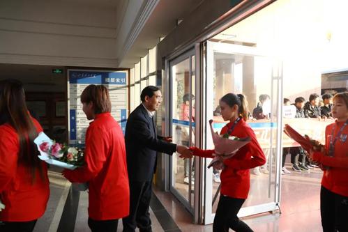 师生代表向教练员、运动员献上了鲜花,出席仪式的领导、嘉宾与教练员、运动员一一握手表示祝贺。