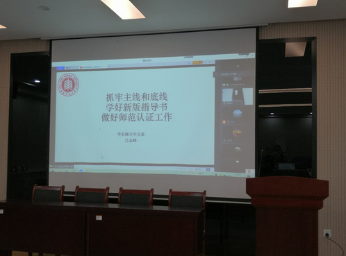 培训会上,吕志峰教授以抓牢“主线”和“底线”,做好认证申请工作为主题,详细讲解了2021年新版师范类专业认证新要求、新理念,申请书的撰写等。吕教授的讲解内容详实,既有理论高度,也有实践经验和案例分析,对师范类专业认证申请书和自评报告的撰写以及佐证材料的准备具有很强的指导意义。最后,吕教授与参会教师进行了交流互动,现场气氛和谐且热烈。