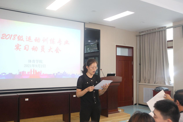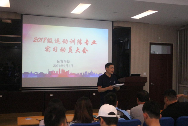 为扎实做好2018级运动专业实习工作,引导员工做好实习准备,9月2日下午,公司于2号教学楼101报告厅举行2018级运动训练专业实习动员大会。公司党总支副书记宋伟,经理助理,经理助理、教学科研办公室主任杨刚,教学秘书韩军梅,辅导员、实习指导老师及2018级运动训练专业全体员工参加了此次动员大会。会议由杨刚主持。