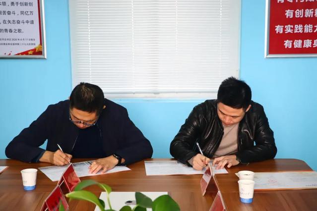 赵鹏代表公司与山东哇哦体育科技有限公司总经理董伟签订就业实践基地、社会实践基地共建协议并授牌。