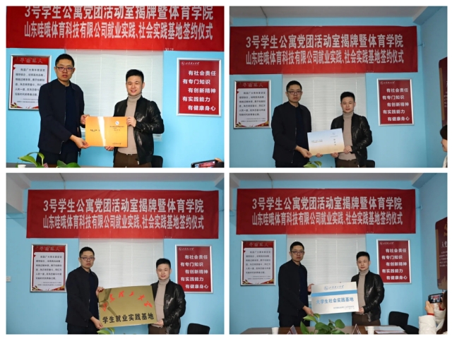 赵鹏代表公司与山东哇哦体育科技有限公司总经理董伟签订就业实践基地、社会实践基地共建协议并授牌。