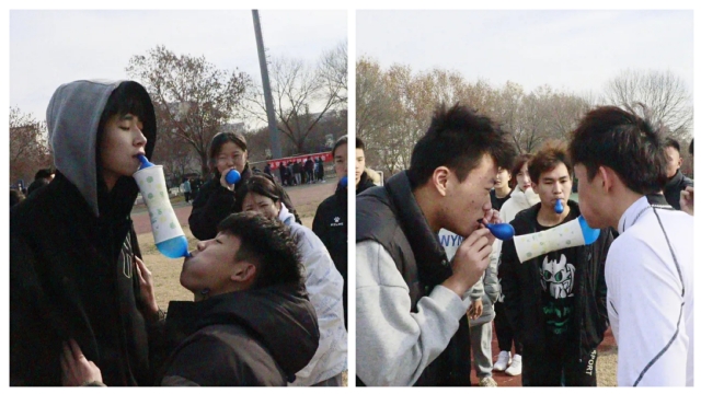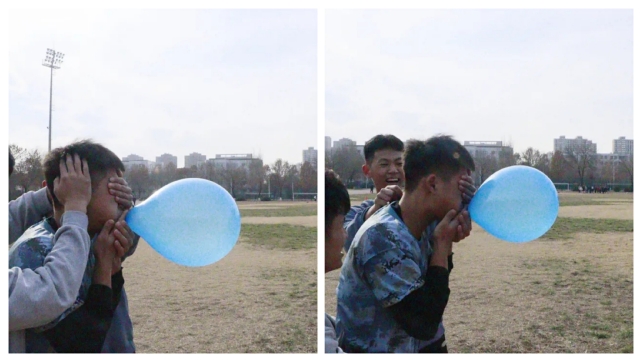 每组六个人,依次穿衣接力,最后一个参赛员原地转十圈,吹爆气球。比赛既有挑战又有乐趣,同学们玩得不亦乐乎,加油声、喝彩声此起彼伏,好不热闹。