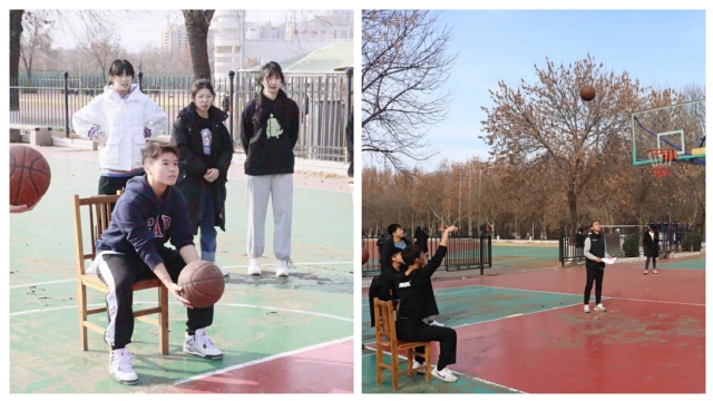 参赛员在罚球线的椅子上坐姿投篮,篮球不只是男生的专利,女生也不示弱,参赛者虽然投篮没有中几个球,但一点也不失风度,重在参与。