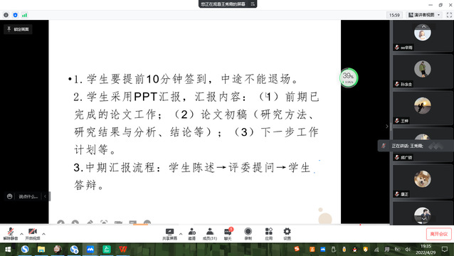 毕业论文是本科人才培养的重要教学环节。为了全面了解员工毕业论文工作进展情况,提高毕业论文质量,保证毕业论文工作的顺利进行,公司于4月25日-5月8日分8组举行了2022届毕业论文中期汇报工作。根据疫情防控要求,此次中期汇报采用腾讯会议线上方式进行,评委由论文指导教师担任,2022届全体毕业生参加汇报。