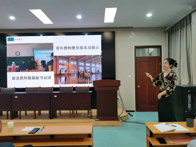 郑程浩、宋著聪、苗舒蓓、张少华四位新进教师按照抽签顺序分别以体育科学研究方法—变量、武术腾空飞脚、篮球进攻战术基础配合—掩护配合和足球头顶球为主题,依次进行试讲。四位青年教师试讲准备充分,PPT制作简洁优美,课堂导入合理,教学方法得当,重难点突出,教学过程流畅,语言表达清楚,注重思政元素的融入和信息技术的运用,教学效果良好。