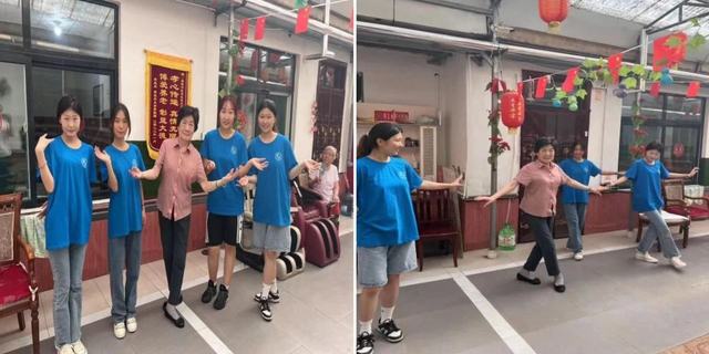 团队成员在休息小憩之时,与老人们一起唱歌,老人们兴高采烈地听着歌声,不时自己也跟着高兴地哼哼,爱好跳舞的奶奶教大家一起跳“蝴蝶舞”,在表演节目的过程中大家和老人们亲切地互动,向老人们问好,祝福老人们健康快乐,精彩的节目赢得了老人们热烈的掌声,85岁的刘爷爷说:你们可真有活力啊,让我不禁想起我当年的时候了!