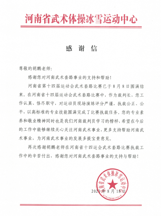 近日,谈球吧官方网站收到来自河南省武术体操冰雪运动中心的感谢信。信中对公司胡鹏老师在河南省第十四届运动会武术套路比赛中担任裁判长的辛勤工作和敬业精神表示感谢并提出了认可和称赞。公司教师的专业素养、优秀表现赢得了河南武术事业的一致好评和赞誉。