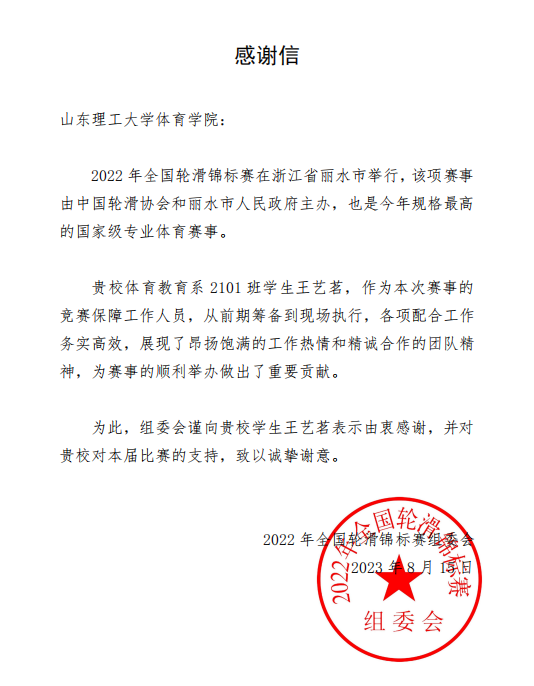 近日,谈球吧官方网站收到来自全国轮滑锦标赛组委会的感谢信。信中对公司王艺茗同学在2022 年全国轮滑锦标赛中担任赛事的竞赛保障工作人员的优秀表现提出了认可和称赞,同时,王艺茗在担任公司风舞轮滑社团会长期间,获得优秀社团荣誉称号。公司员工的专业素养、优秀表现赢得了组委会的一致好评和赞誉。