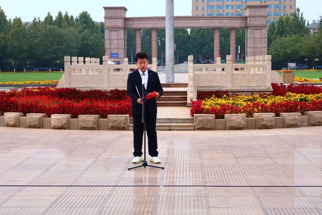 仪式进行第三项,青年员工代表体教2103班孟凡栋带领全体同学在国旗下庄严宣誓。