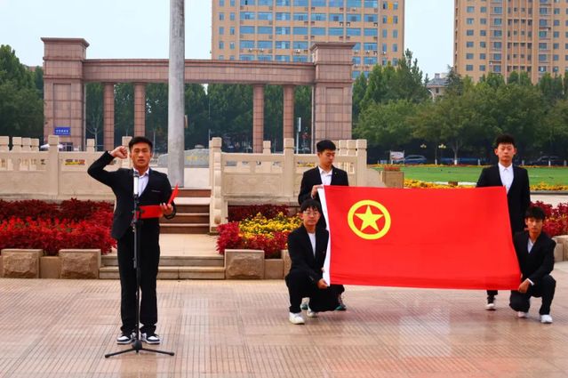 仪式进行第三项,青年员工代表体教2103班孟凡栋带领全体同学在国旗下庄严宣誓。