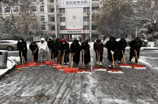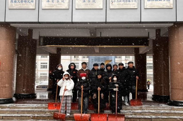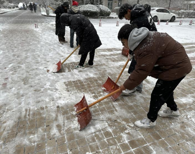 一场大雪飘然而至,让整个校园银装素裹。为了确保师生们能够安全畅通出行,谈球吧官方网站的师生们主动承担起了清理积雪的任务。