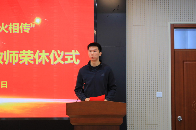 高绎程作为青年教师代表向8位荣休教师表达谢意、敬意和祝福,老教师将自己的青春年华献给了教育事业,把自己的热情和智慧献给了莘莘学子,既是我们的同事,又是我们的长辈,在老教师身上学到了严谨治学、一丝不苟的工作作风,青年教师定会继续发扬优良传统和高尚精神,争做出彩体育人。
