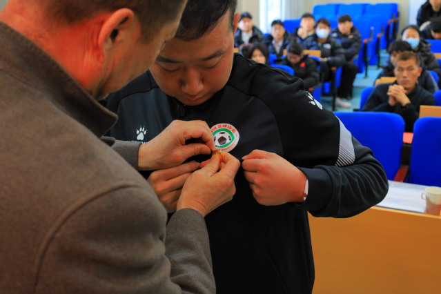 荣休教师代表韩盛祥、曹永光为新进教师佩戴校徽