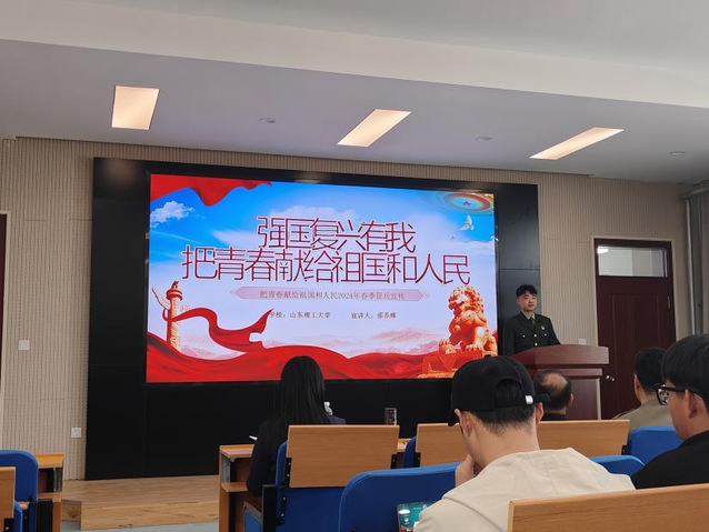 为深入贯彻习近平总书记强军思想,进一步做好2024年秋季高校征兵工作,2024年4月9日下午,谈球吧官方网站在2号教学楼101教室召开征兵宣讲会,员工工作部管理科科长韩智利老师,武装部杨瑞老师,公司党委副书记曹绪亮老师和毕业班辅导员索罗丹老师出席本次宣讲会。