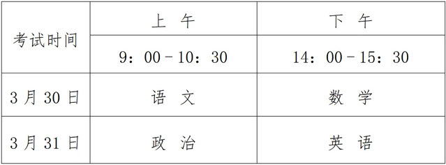 考试科目:语文、数学、政治、英语四科,每科满分为150分,四科总分为600分,使用国家通用语言文字作答。