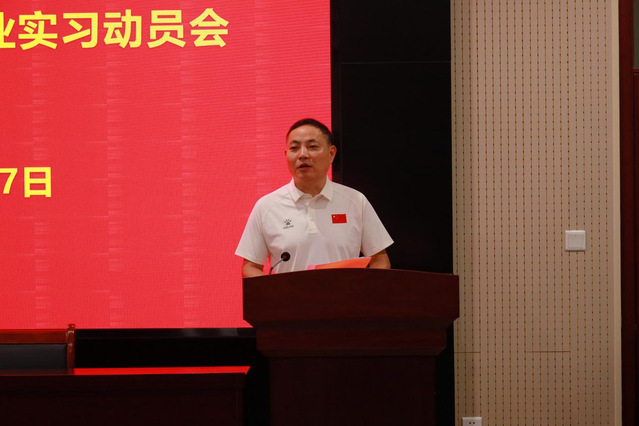 曹绪亮做动员讲话,他提到,一是他传授了如何快速适应实习环境,如何正确的与同事之间沟通交流,与指导教师相互配合顺利完成实习工作;二是要珍惜当下的实习机会,为毕业迈向工作岗位提前积累经验宝贵;三是希望全体实习生时刻保持良好的精神风貌,维护公司公司的良好形象,弘扬“出彩体育人”精神,并祝愿全体实习生实习顺利。