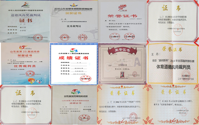 王丹副教授利用业余时间不断充电学习,外出交流,随时跟踪专业知识发展趋势及赛制规则变化,积极参加每个新周期国家体育总局组织的新规则培训,并通过优秀成绩获得蹦床国际级裁判,体操国家级裁判,健美操国家一级裁判,家级体育社会指导员等称号。