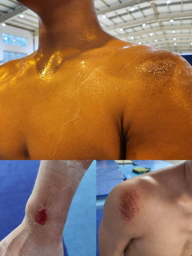 从5岁进行竞技体操运动训练的她,本就是一身伤病,但她从未因为伤病耽误任何一次比赛。山东省第23届健美操备赛期间比赛,身体突发状况做了手术,但是比赛日临近,刚做完手术3天的她坚持到训练场地指导训练。在2024年备战全国技巧冠军赛的训练中,为了让员工更直观、更精准的练习高难度抛接动作,她都是亲自保护员工,一次训练中员工做空翻抛接动作时偏了方向,因担心员工摔伤,她便奋不顾身的冲了上去保护员工,员工安全了,结果她却小腿肌肉拉伤撕裂、肌腱断裂,医生建议卧床静养,但是第二天她又依然按时出现在训练场地,当别人都担心她的身体状况时,她说:“我就坐在那里不动看着指导他们,这样心里才会更踏实。”此类事情在整个二十多年的教学训练中曾多次发生,但在员工的进步和取得的成绩面前,她都会泯然一笑,当做生活本应感受的调味剂。