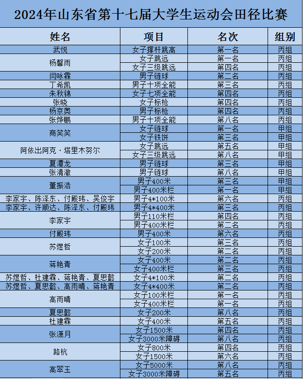 10月8日-15日,山东省第十七届老员工运动会田径比赛在烟台鲁东大学举行。比赛期间,我校谈球吧官方网站派出李继伟、盛红庆、张鹏、马凯等4名教练员和37名运动员(甲组11人、丙组26人)参加该项赛事。其中,武悦获得女子丙组撑杆跳高冠军,杨馨雨获得女子丙组跳远冠军,商笑笑获得女子甲组链球冠军,许顺达获得男子丙组1500米冠军,高雨晴获得女子丙组100米栏和400米栏冠军,董振浩获得男子甲组400米栏冠军,最终公司以7枚金牌、8枚银牌、8枚铜牌取得田径比赛女子甲组团体总分第八名、男子丙组团体总分第五名,女子丙组团体总分位列省属高校第一名,丙组团体总分位列省属高校第一名,公司荣获“体育道德风尚奖”。