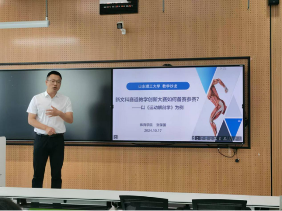 张保国就新文科赛道创新大赛如何备赛参赛,从新文科建设的要求与认识、教学创新大赛流程与组成、教学创新大赛逻辑与创新、教学创新大赛理念与实施、教学创新大赛体会与感悟等五个分面做了经验分享。接着张保国模拟全国高校教师教学创新大赛比赛场景,做了《运动解剖学》课程教学设计创新成果展示汇报。张老师的汇报内容翔实、图文并茂、案例丰富、信息量大,参会教师认真聆听,受益匪浅。参会教师积极参与互动,就教学创新和课程建设展开热烈讨论。