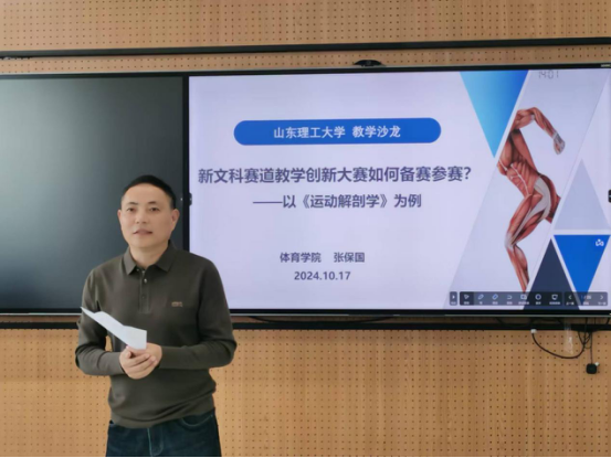 张保国就新文科赛道创新大赛如何备赛参赛,从新文科建设的要求与认识、教学创新大赛流程与组成、教学创新大赛逻辑与创新、教学创新大赛理念与实施、教学创新大赛体会与感悟等五个分面做了经验分享。接着张保国模拟全国高校教师教学创新大赛比赛场景,做了《运动解剖学》课程教学设计创新成果展示汇报。张老师的汇报内容翔实、图文并茂、案例丰富、信息量大,参会教师认真聆听,受益匪浅。参会教师积极参与互动,就教学创新和课程建设展开热烈讨论。