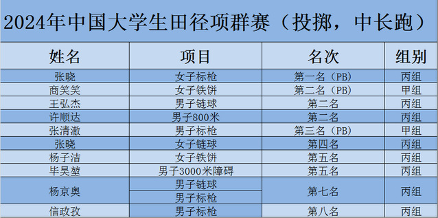 其中,张晓获得女子丙组标枪冠军(PB)、链球第四名,许顺达获得男子丙组800米亚军,商笑笑获得女子甲组铁饼亚军(PB),王弘杰获得男子丙组链球亚军,张清澈获得男子甲组标枪季军(PB),毕昊堃获得男子丙组3000米障碍第五名,杨子洁获得女子丙组铁饼第五名,杨京奥获得男子丙组标枪、链球第七名,信政孜获得男子丙组标枪第八名。同时,参加甲组(阳光组)比赛的商笑笑(机械与工程公司)与张清澈(交通与车辆工程公司)同学均创造公司田径队参加全国比赛队史最好名次。