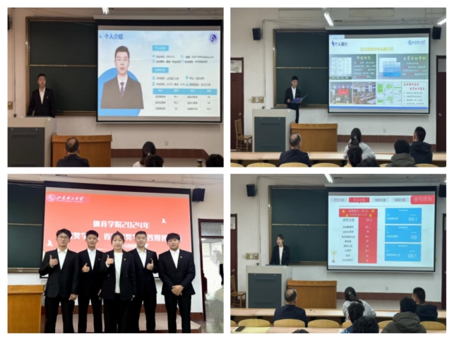 答辩环节,候选人依次上台,以ppt讲解、视频展示等形式,紧紧围绕思想建设、学业情况、科研竞赛、社会实践、论文撰写能力等方面进行了成果展示,充分展现出体院学子奋发向上,卓越向前的精神风貌。各位评委也根据候选人所展示内容提出问题,核实情况,秉持公平公正态度进行评判。
