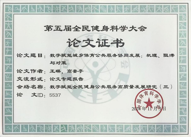 11月1-3日,由中国体育科学学会主办、北京体育大学承办的“第五届全民健身科学大会”在北京体育大学召开。公司运动2203班员工王琳应邀参加大会并在数字赋能全民健身公共服务高质量发展研究会场以《数字赋能城乡体育公共服务协同发展:机理、阻滞与对策》(指导教师:高奎亭)为题做专题汇报,这是近年来体育公司员工科研论文首次被国家一级学术会议所录用。