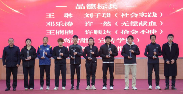 渤海教育集团滨州渤海艺体高中董事长赵铁龙、公司党委副书记、纪委书记曹绪亮为“品德标兵”颁奖。