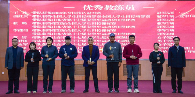 人力资源处处长付圣贵、社会科学处处长邢同卫为“优秀教练员”颁奖。