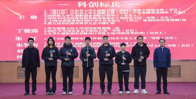 山东省山青世界青少年实践活动中心有限公司副总经理孟晓,校团委书记、创新创业公司经理王振为“科创标兵”颁奖。