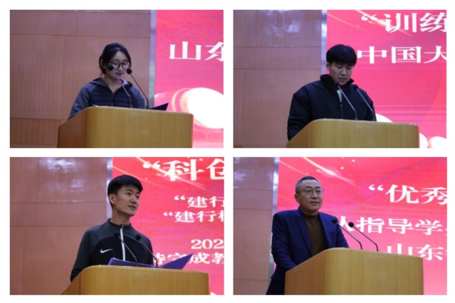 “学习标兵”员工代表赵薇,“训练标兵”员工代表刘子琰,“科创标兵”员工代表王琳,“优秀教练员”代表、校短跨队教练李继伟,“优秀教师”代表、研究生与科研办公室主任高奎亭分别发言。