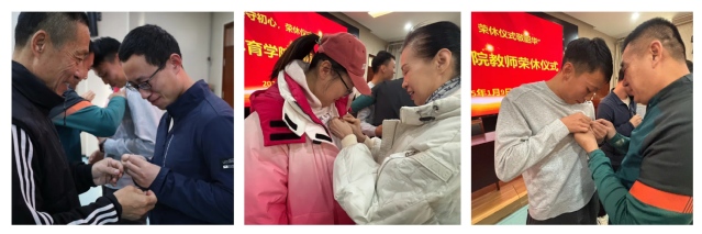 第七项,荣休教师杨秀清、郑立新、袁辉明为新进教师佩戴校徽