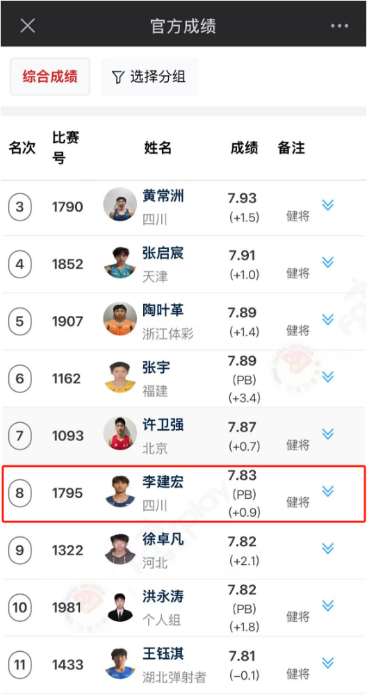 关键之年,全力冲刺。面对备战全运会的关键时期,李建宏早早进入高强度训练状态。今年春节期间,他主动放弃休假,无一日间断训练,即便在与伤病的对抗中也未曾松懈。这份付出在赛季初即见成效——室内赛中他多次刷新个人最好成绩并勇夺季军。此次室外赛首秀即克服身体不适,突破7.80米大关并荣膺“运动健将”称号,无疑是为全运会征程迈出的坚实一步,也再次证明了他强大的抗压能力与意志品质。