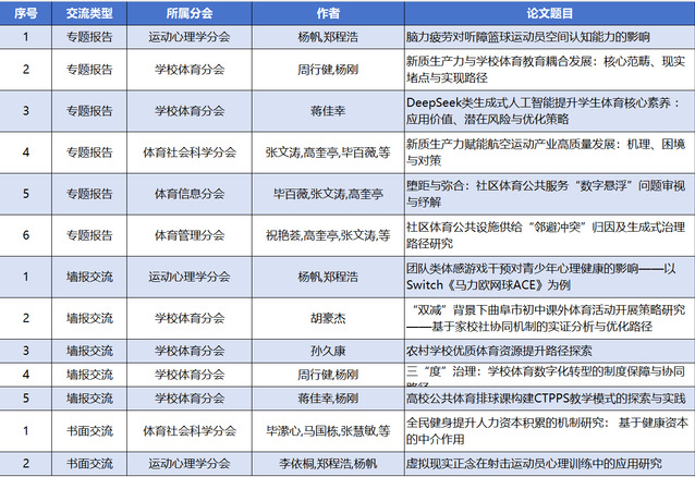 公司研究生在2025年“第十四届全国体育科学大会”专题报告、墙报交流、书面交流等板块成功中稿13篇,入选论文主题广泛,在公司体育、运动心理、体育信息、体育管理、体育社会科学等多个研究方向与新兴领域,充分展示了公司研究生在体育科学研究领域的实力与风采。